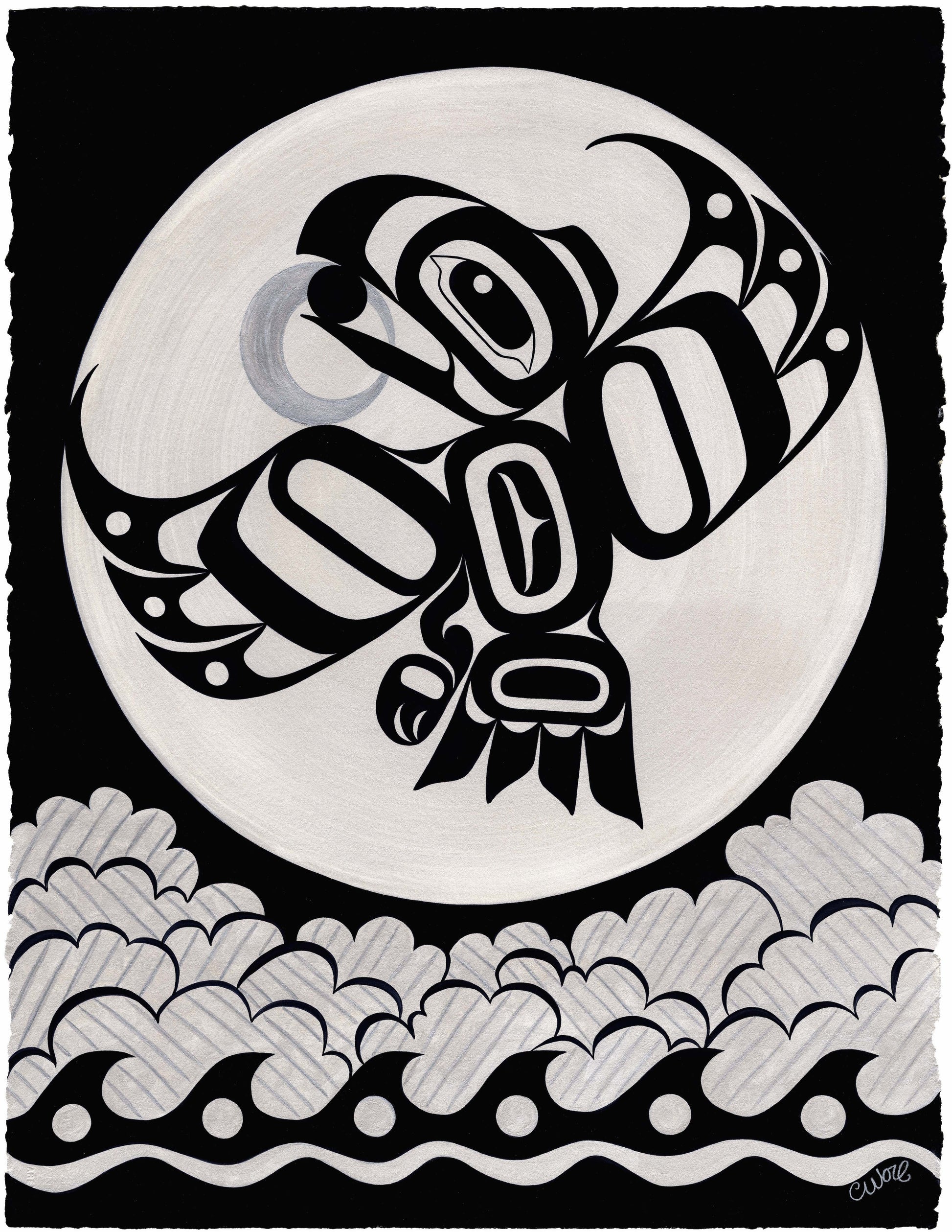 Raven's Eclipse represents the popular Tlingit tale, Raven and the Box of Daylight.