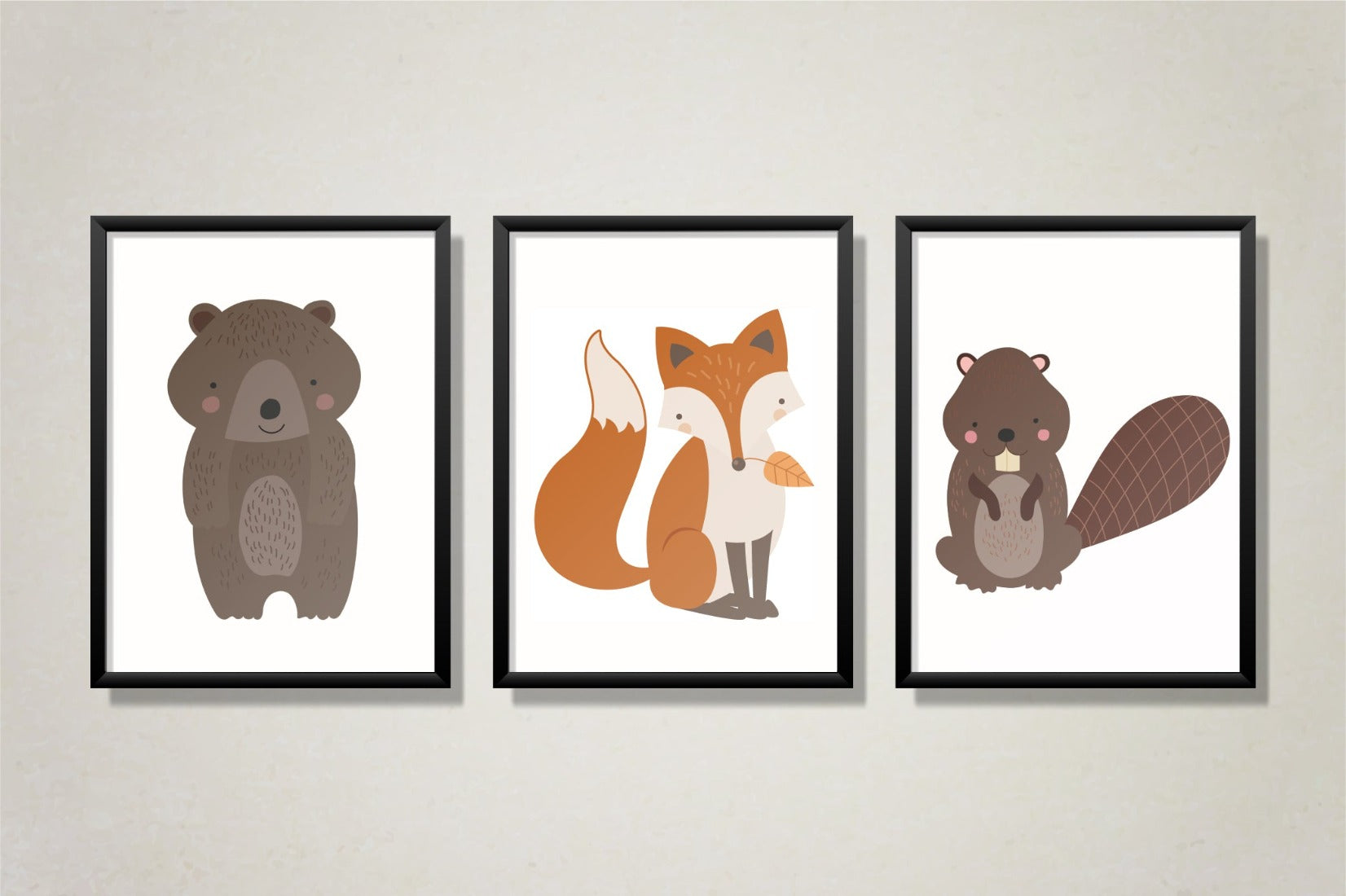 Add that final touch to your child’s room or nursery with one of our bright and whimsical art prints. Available in a large selection of sizes and cute designs which are sure to compliment your child's bedroom or baby's nursery. This set of three art prints features cute woodland animals including a bear, a fox, and a beaver.