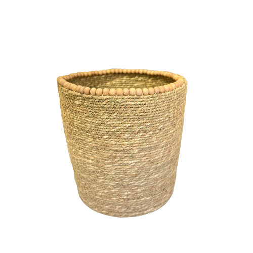 Our baskets are handmade with woven jute and edged in wooden beads.