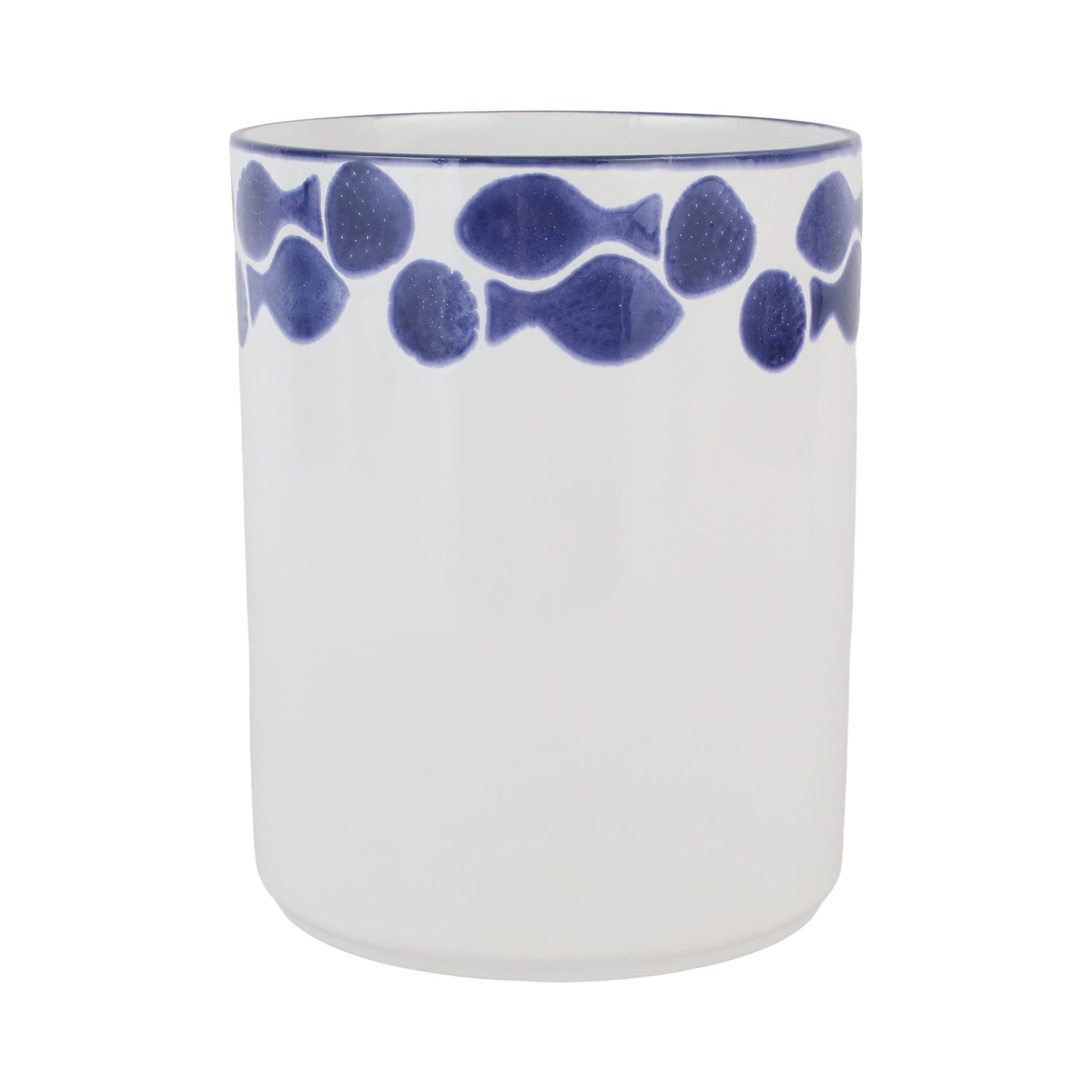 Recreate the beautiful mosaic tiles found in the Greek Isles with the Santorini Fish Waste Basket, painted on hard ceramic in a fun blue and white pattern.