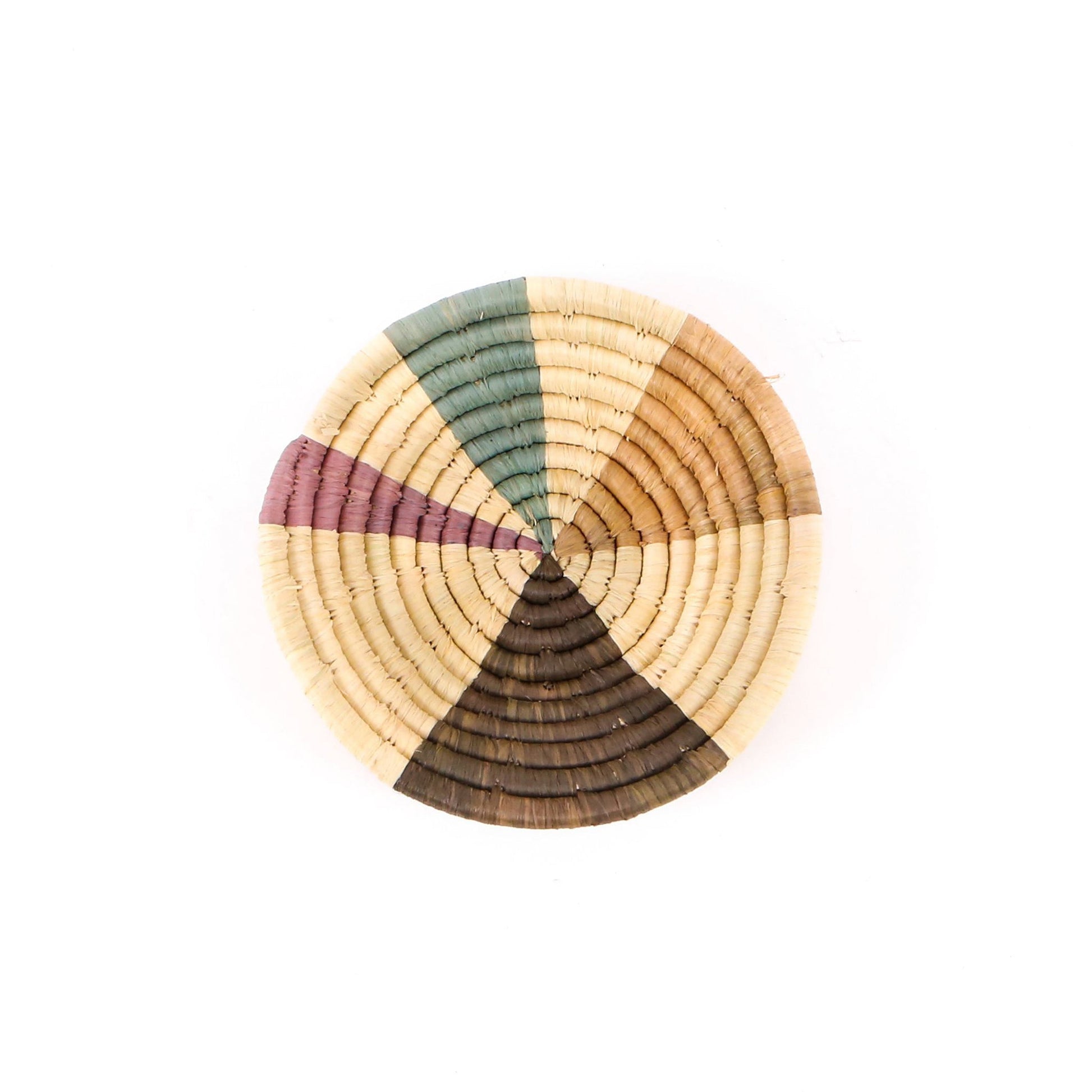 A wheel design emerges on the natural raffia and sweetgrass foundation of this round basket. Orchid, pistachio, buttercup, and chocolate accent the simple form.