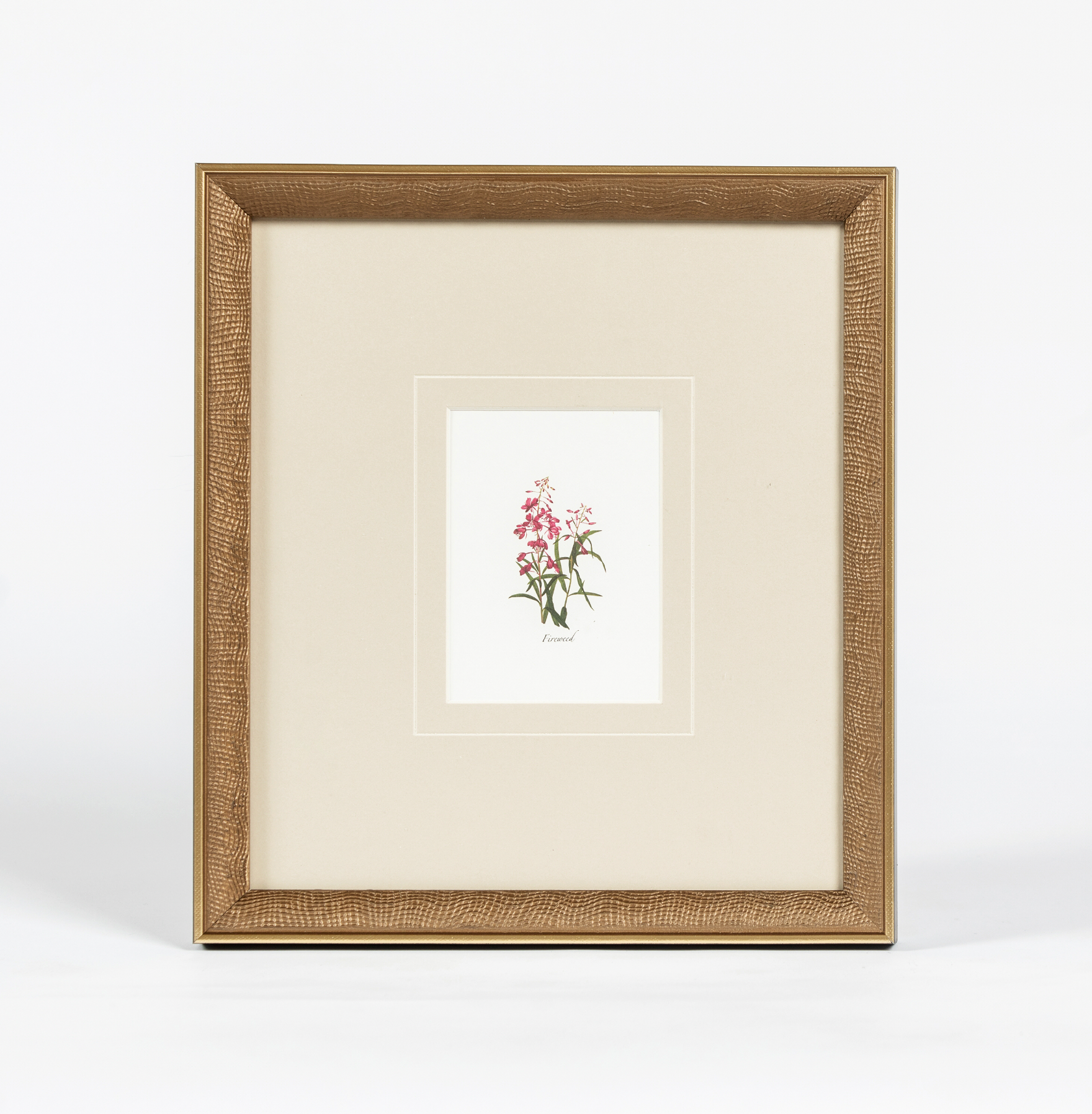 The Western Wildflower Collection features traditional petite botanicals framed in a neutral matting and antique gold frame. Western Wildflower 1 illustrates a rose colored fireweed plant.